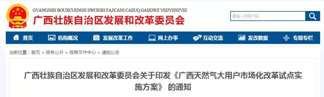 广西壮族自治区发展和改革委员会关于印发《广西天然气大用户市场化改革试点实施方案》 的通知